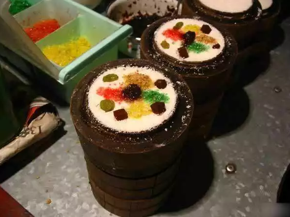 In old times, street peddler used to carry a cupboard with a stove to sell jinggao all over the place. The cupboard has several drawers, as it keeps raw materials including glutinous rice, brown sugar or red sugar, walnut kernel, rose petals and colored stripped condiments.