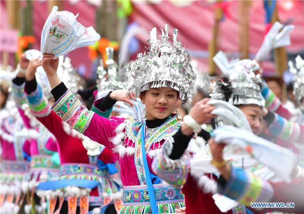 Villagers of Miao ethnic group dance to celebrate "hundred-bird dress" festival in Gandong township of Rongshui Miao autonomous county in Liuzhou, South China's Guangxi Zhuang autonomous region, Feb 16, 2019. [Photo by Huang Xiaobang/Xinhua]