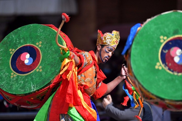 A Tibetan Buddhist monk performs during a Cham dance ritual at the Qoide Monastery in Gonggar county of Shannan prefecture, Southwest China's Tibet autonomous region, Feb 19, 2019. Dressed in colorful costumes, lamas danced to pounding drums at the Qoide Monastery during the Tibetan New Year celebrations. The Cham dance is a vibrant masked and costumed ritual performed by Tibetan Buddhist monks to exorcise evils and pray for blessings. The Qoide Monastery has a 500-year history of performing the Cham dance. The Cham dance here was listed as one of the national intangible cultural heritages in 2011.[Photo/Xinhua]