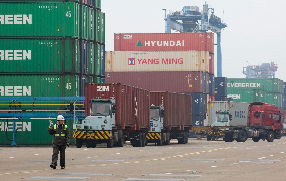 A port worker directs vehicles carrying containers at a container terminal in Zhoushan Port, Ningbo, Zhejiang province, in December. [Photo by Suo Xianglu/For China Daily]