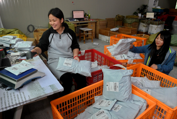 Staff members of an e-commerce company scan the barcode on packages in Putian, East China's Fujian province, Feb 20, 2019. [Photo/Xinhua]