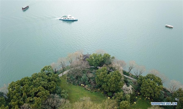 Aerial photo taken on Feb 22, 2019 shows tourists visiting the West Lake by boat in Hangzhou, East China's Zhejiang province. [Photo/Xinhua]
