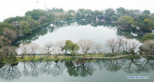 Aerial photo taken on Feb 22, 2019 shows tourists visiting the West Lake in Hangzhou, East China's Zhejiang province. [Photo/Xinhua]