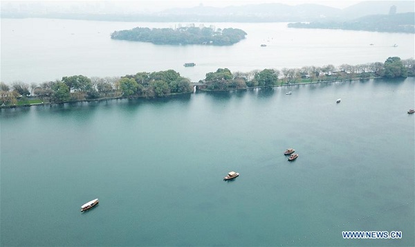 Aerial photo taken on Feb 22, 2019 shows tourists visiting the West Lake in Hangzhou, East China's Zhejiang province. [Photo/Xinhua]