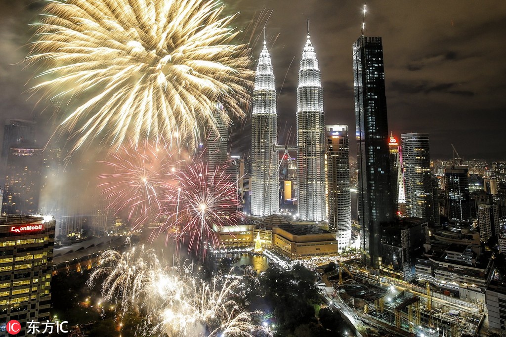 Fireworks illuminate the night sky over Malaysia's Petronas Towers on Jan 1, 2018. [Photo/IC]
