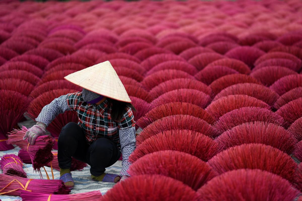 A Vietnamese woman collects dried incense sticks in a courtyard in the village of Quang Phu Cau on the outskirts of Hanoi. [Photo/Agencies]