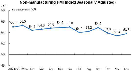 In December 2018, China's non-manufacturing purchasing managers’ index was 53.8 percent, an increase of 0.4 percentage points from the previous month, indicating that the pace of non-manufacturing growth has accelerated.