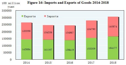 The total value of imports and exports of goods in 2018 reached 30.51 trillion yuan($4.61 trillion), up by 9.7 percent from the previous year. Of this total, the value of goods exported was 16.42 trillion yuan, up by 7.1 percent; the value of goods imported was 14.09 trillion yuan, up by 12.9 percent. The surplus of trade in goods reached 2.33 trillion yuan, down by 521.7 billion yuan from the previous year.