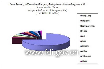 From January to December, the top ten nations and regions with investment in China (as per the actual input of foreign capital) were as follows: Hong Kong(USD96.01b), Singapore (USD5.34b), Taiwan province(USD5.03b), R.O.K.(USD4.67b), the U.K.(USD3.89b), Japan (USD3.81b), Germany (USD3.68b), U.S.A. (USD3.45b), Netherlands (USD1.29b) and Macao (USD1.29b). The total of actual investment input from these sources accounted for 95.2 percent of the total of actually input foreign or regional investment in the country.