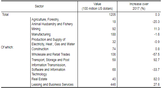 In 2018, the non-financial outbound direct investment reached 797.4 billion yuan, a decrease of 1.6 percent, or $120.5 billion, up by 0.3 percent. Of this total, that to countries along the Belt and Road reached $15.6 billion, up by 8.9 percent.