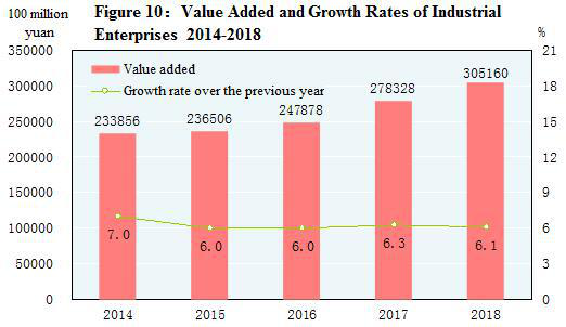 In 2018, the total value added of the industrial sector was 30.52 trillion yuan($4.61 trillion), a rise of 6.1 percent from the previous year. The value added of industrial enterprises above designated size increased by 6.2 percent.