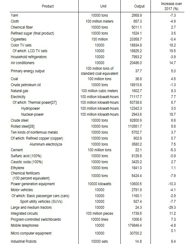 In 2018, of the industrial enterprises above designated size, the value added for agricultural product food processing and sideline products was up by 5.9 percent from the previous year; for the textile industry, it was up by 1.0 percent; for the manufacturing of raw chemical materials and chemical products, it was up by 3.6 percent; for the manufacturing of non-metallic mineral products, it was up by 4.6 percent; for smelting and pressing of ferrous metals, it was up by 7.0 percent; for the manufacturing of general purpose machinery, it was up by 7.2 percent; for the manufacturing of special purpose machinery, it was up by 10.9 percent; for the manufacturing of automobiles, it was up by 4.9 percent; for the manufacturing of electrical machinery and apparatus, it was up by 7.3 percent; for the manufacturing of computers, communication equipment and other electronic equipment, it was up by 13.1 percent; and for the production and supply of electricity and heat power, it was up by 9.6 percent.