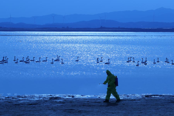 A conservation officer disinfects the areas surrounding Swan Lake. [PHOTO BY WANG JING/CHINA DAILY]