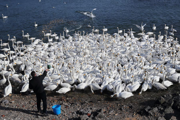 A staff member feeds the swans. [PHOTO BY WANG JING/CHINA DAILY]