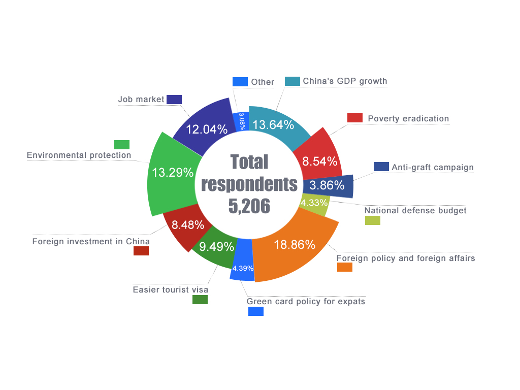 In the survey, 18.9 percent of the respondents said foreign policy and foreign affairs were the most-anticipated topic, followed by China’s GDP growth (13.6 percent), environmental protection (13.3 percent) and the job market (12 percent). A total of 5,206 people had submitted answers as of Saturday.