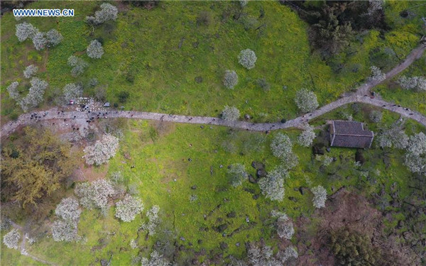 Aerial photo taken on March 3, 2019 shows tourists going out and enjoying the scenery and blossom of flowers at Tongbantun Village, Rong'an County, south China's Guangxi Zhuang Autonomous Region. Tongbantun village lied in the remote and impoverished mountainous region. Long Gexiong, villager of Tongbantun, who had been out to do migrant work for 20 years, made the decision to return to his hometown to start a business in 2012. He and a few cousins used their savings to set up a farmer cooperative for fruit sales and rural tourism. The local government strongly supported them with the infrastructure construction. After several years of development, the small village had undergone enormous changes. Every spring, the blossom of plum and cole flowers attracted many tourists from across the country. Today, the previously poor rural village had blossomed into a famous exemplary village in Guangxi. [Photo by Huang Xiaobang/Xinhua]