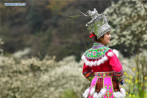 A tourist poses for photo at Tongbantun Village, Rong'an County, south China's Guangxi Zhuang Autonomous Region, March 2, 2019. Tongbantun village lied in the remote and impoverished mountainous region. Long Gexiong, villager of Tongbantun, who had been out to do migrant work for 20 years, made the decision to return to his hometown to start a business in 2012. He and a few cousins used their savings to set up a farmer cooperative for fruit sales and rural tourism. The local government strongly supported them with the infrastructure construction. After several years of development, the small village had undergone enormous changes. Every spring, the blossom of plum and cole flowers attracted many tourists from across the country. Today, the previously poor rural village had blossomed into a famous exemplary village in Guangxi. [Photo by Huang Xiaobang/Xinhua]
