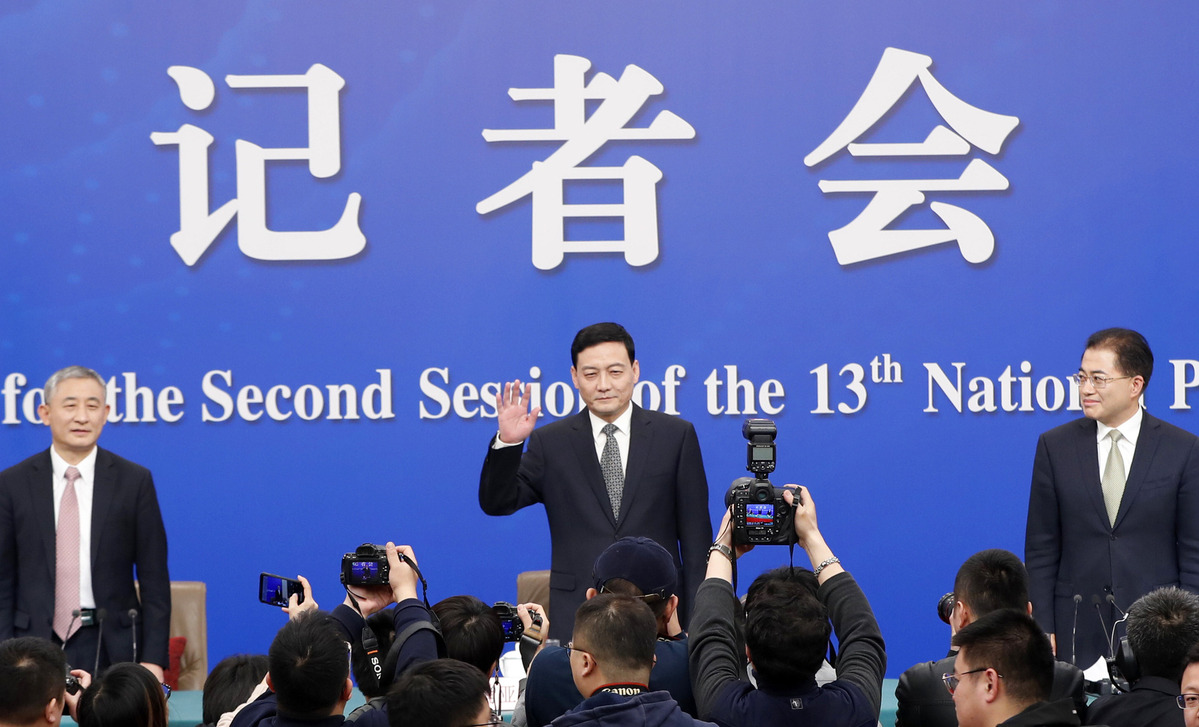 Xiao Yaqing, head of the State-owned Assets Supervision and Administration Commission (SASAC); Weng Jieming, deputy head of the State-owned Assets Supervision and Administration Commission, and Peng Huagang, deputy secretary-general and spokesman of the State-owned Assets Supervision and Administration Commission answered questions on reform and development of State-owned companies at a press conference during the second session of the 13th National People's Congress on March 9, 2019.