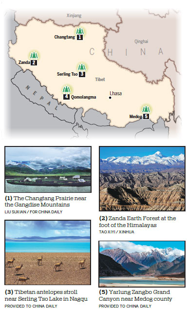 The five locations encompass areas around Qomolangma, Bome and Medog counties, the Zanda Earth Forest in western Tibet, the Changtang Plateau, and Serling Tso, which is Tibet's largest lake, according to Yao Tandong, director of the Qinghai-Tibet Plateau Institute of the Chinese Academy of Sciences, who spoke to China Daily in an exclusive interview.