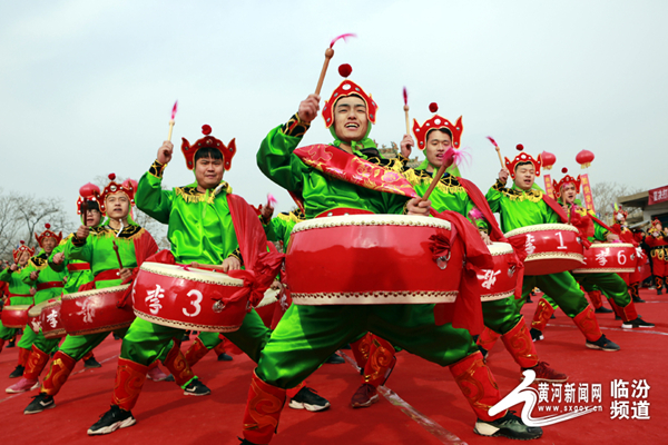 Performers dressed in green costumes beat Weifeng Drums during a shehuo show in Taosi village, March 8. The Weifeng Drum has a history dating back over 4,000 years in Linfen and is part of a folk music tradition consisting of an instrumental ensemble of drums, cymbals, gongs and small cymbals. Its beat is characterized by simple yet powerfully resonating sounds. It was recognized as a national intangible cultural heritage in 2006. [Photo/sxgov.cn]