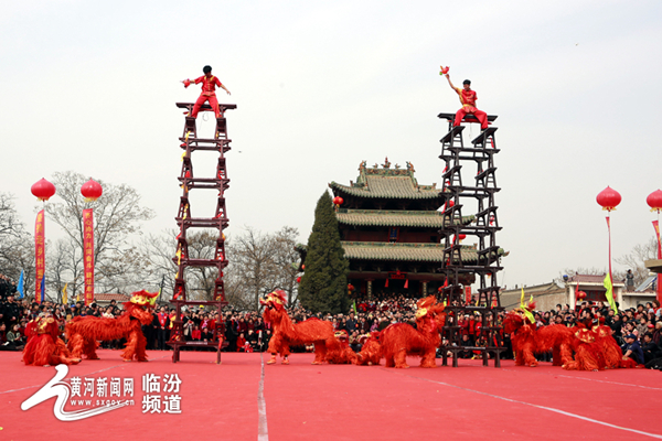 The Tianta Lion Dance performance is staged during a shehuo show in Taosi village, March 8. The Tianta (Heavenly Tower) Lion Dance, which originated during the Sui (581-618) and Tang (618-907) dynasties, is full of vigor and surprising sudden moves on towering scaffolds. It was listed as a national intangible cultural heritage in 2006. [Photo/sxgov.cn]