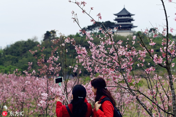 Visitors take photos of the cherry blossoms in a scenic spot in Nanning city, South China's Guangxi Zhuang autonomous region, on Feb 21, 2019. [Photo/IC]