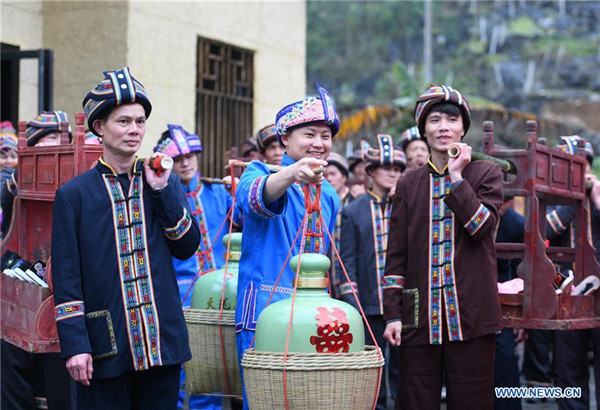 A team send dowries to the bridegroom's home at a wedding ceremony in Mianhua Village of Siba Township of Luocheng Mulao Autonomous County, south China's Guangxi Zhuang Autonomous Region, March 17, 2019. A traditional wedding ceremony of the Mulao ethnic group is held here on Sunday. [Photo by Meng Zengshi/Xinhua]