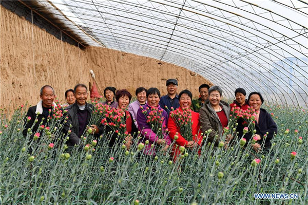 Farmers pose for a group photo in a greenhouse at Yangjiadui Village of Wulongshan Township in Huguan County, north China's Shanxi Province, March 13, 2019. By developing a flower planting industry, Yangjiadui Village has been lifted out of poverty in 2017. Per capita income in Yangjiadui Village reached 5,300 yuan (about 789 U.S. dollars) in 2018. [Photo by Zhan Yan/Xinhua]