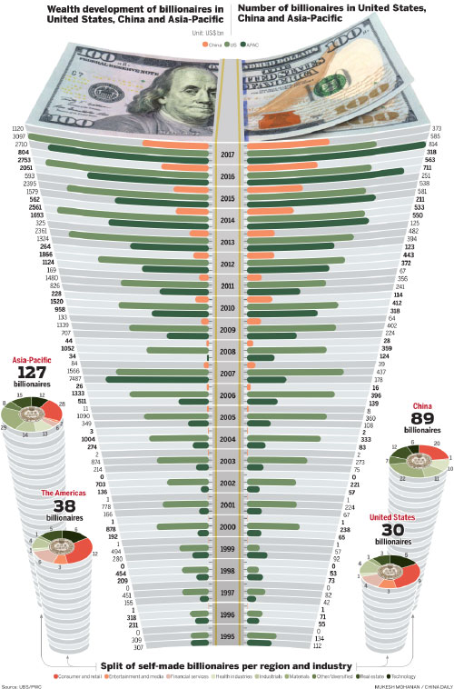 In comparison, the US still leads the global league table, but wealth creation in that country appears to be slowing, with only 53 new billionaires created in 2017.