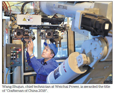 Currently, Weichai's chief technician work station is constituted by six branches. There are also seven model worker innovation workshops and 29 craftsman workshops. Those workshops, covering 10 working units in Weichai, have registered 148 patents, upgraded more than 470 sets of equipment and completed 456 innovation projects. They have helped Weichai to cut costs by 120 million yuan, according to the company.