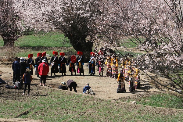 Local Tibetans line up for a dance under peach trees during the peach flower festival in Nang county, Nyingchi. [Photo by Yang Youhong/For chinadaily.com.cn]