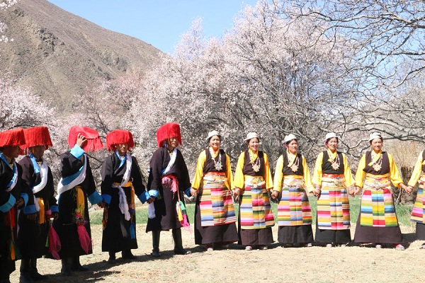 Local Tibetans line up for a dance under the peach trees during the peach flowers festival. [Photo by Yang Youhong/For chinadaily.com.cn]