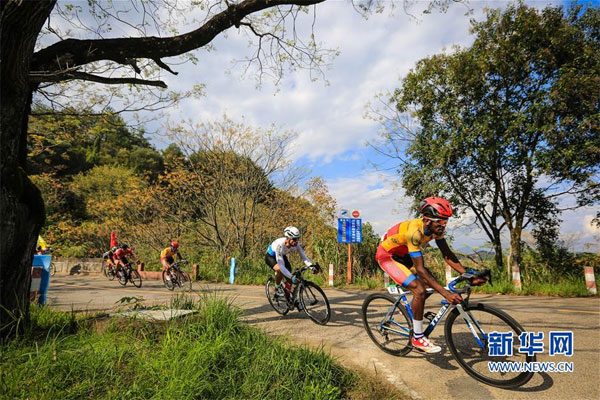 Cyclists taking part in the Fifth Mount Wuyi International Cycling Tour Festival, race through Mount Wuyi Scenic Area in Fujian province. The cycling tour festival was held in the scenic area Nov 24-25, 2018. [Photo/news.cn]