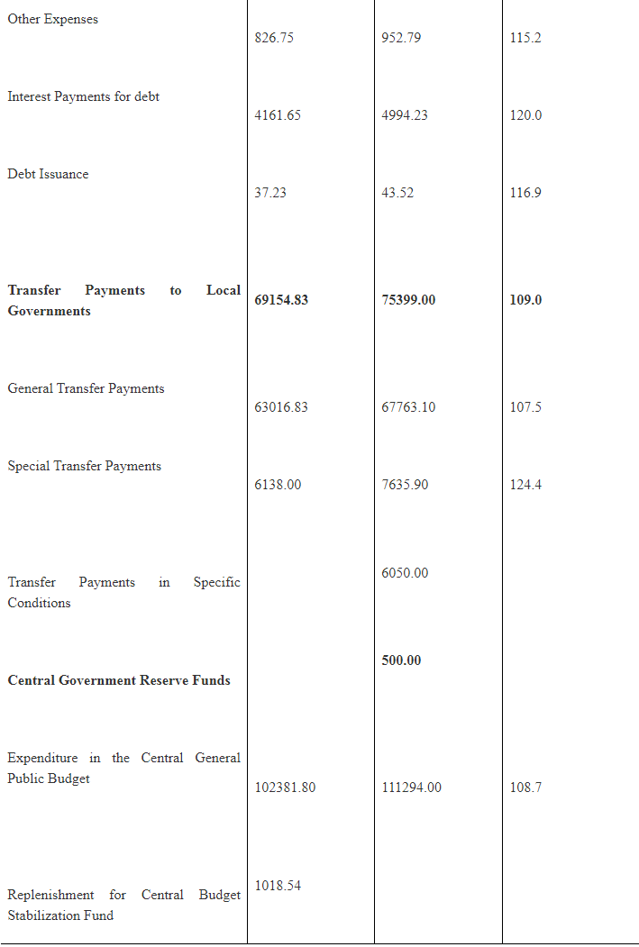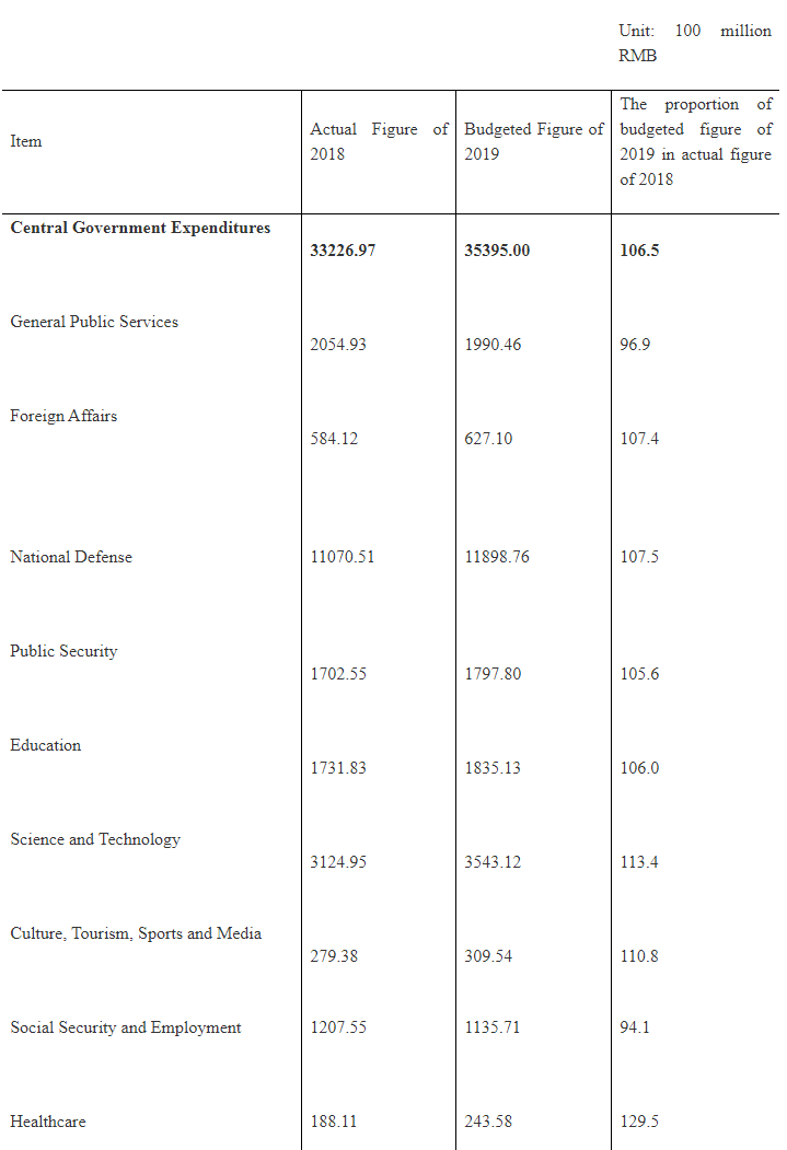 2. The figure of expenditures in the 2019 central general public budget reached 11.13 trillion yuan. With the carry-over expenditures of 184.03 billion yuan from the previous fiscal year, the expenditures in the central general public budget totaled 11.31 trillion yuan. For details, refer to the budget sheet and notes of expenditures spent at the central level and transfer payments made to local governments.