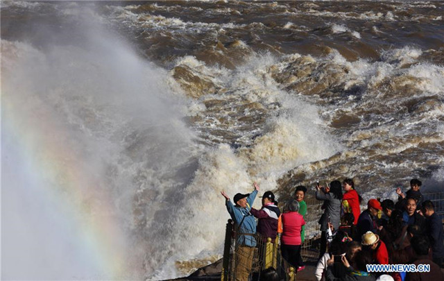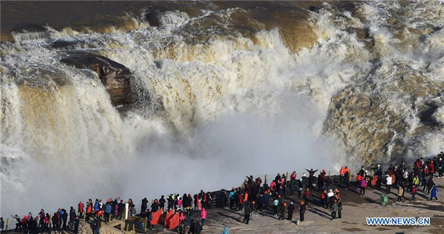 Tourists visit the Hukou Waterfall of the Yellow River in Jixian County, north China's Shanxi Province, March 30, 2019. [Photo by Lyu Guiming/Xinhua]