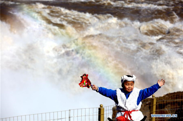 A child poses in front of the Hukou Waterfall of the Yellow River in Jixian County, north China's Shanxi Province, March 30, 2019. [Photo by Lyu Guiming/Xinhua]