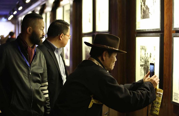 Wu Yuchu (R), the head of the Tibet Yak Museum, takes a picture of the displayed photos in Potala Palace in Lhasa on Friday. [Photo by Palden Nyima/chinadaily.com.cn]