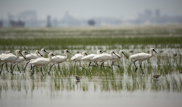 A flock of black-faced spoonbills, a critically endangered bird species, is seen in a wetland in Fuqing, East China's Fujian province, during a bird-watching event held by the Fujian Bird Watching Society from March 25 to 31. [Photo by Lu Guocheng/provided to chinadaily.com.cn]