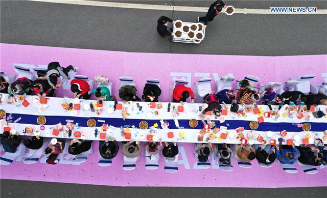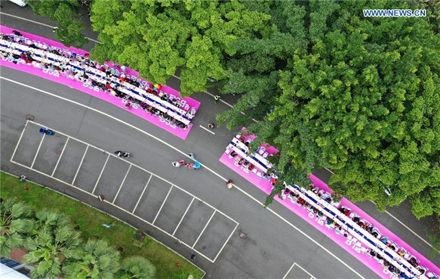 In this aerial photo taken on april 3, 2019, people eat Luosifen, a local rice noodle dish featuring cooked river snails as ingredient, at a long-table feast in Liuzhou, south China's Guangxi Zhuang Autonomous Region. More than 2,000 people joined the feast which was served on tables measuring 1,000 meters in length here on Wednesday. [Photo by Li Hanchi/Xinhua]