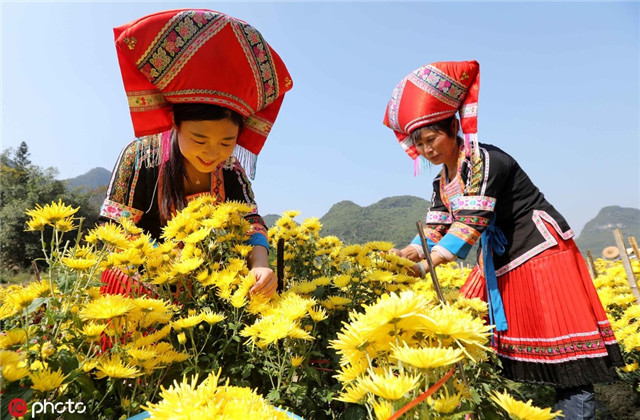 Two women harvest golden chrysanthemums in this photograph taken in Rong’an county, Liuzhou city, Guangxi Zhuang autonomous region, on Nov 4, 2018. [Photo/IC]