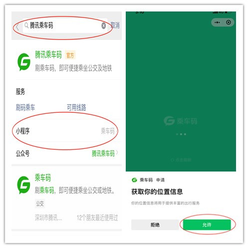 Open WeChat to search Tencent Riding Code Payment (腾讯乘车码), and click the link that has been circled. [Photo/www.chinaservicesinfo.com]
