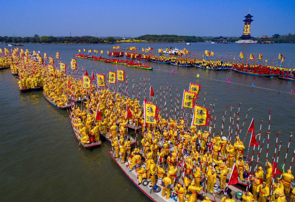 In this aerial photo taken on April 6, 2019, people get ready for a boat performance during the 2019 Qintong Boat Festival held at Qinhu National Wetland Park in Jiangyan District of Taizhou, East China's Jiangsu province. Hundreds of boats with more than 10,000 boat team members aboard gathered here on Saturday for the Qintong Boat Festival, which has been a centuries-old tradition. [Photo/Xinhua]