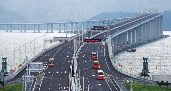 Vehicles travel on the Hong Kong-Zhuhai-Macao Bridge. [Photo/southcn.com]