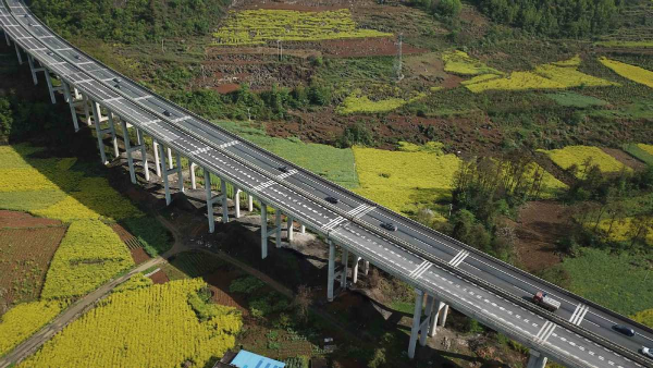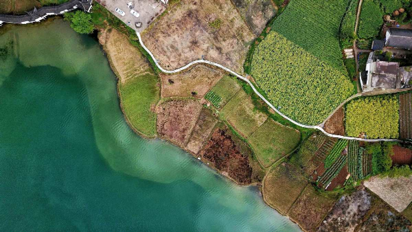 An aerial photo shows rapeseed flower fields of Dahaizi village. [Photo by Zhang Chen/provided to chinadaily.com.cn]