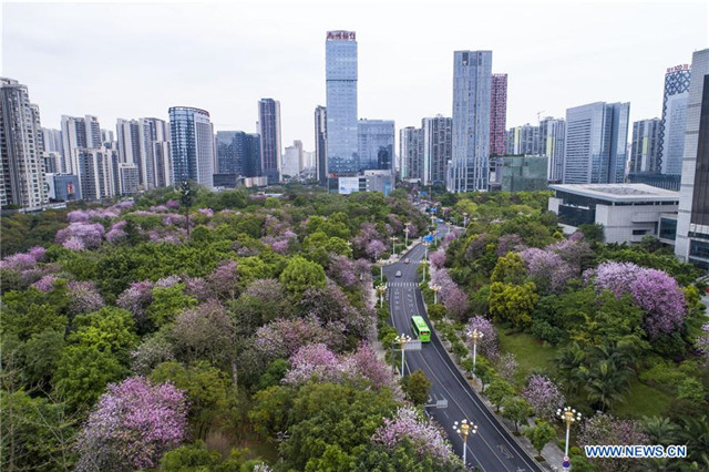 Aerial photo taken on April 12, 2019 shows Bauhinia flowers blooming at the Hedong Park in Liuzhou City, south China's Guangxi Zhuang Autonomous Region. [Photo by Li Bin/Xinhua]