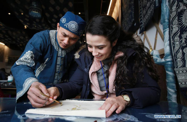 An overseas student tries the Miao ethnic batik with the help of a craftsman in Danzhai county, Southwest China's Guizhou province, Jan 11, 2018. Overseas students of Yenching Academy of Peking University experienced Chinese intangible cultural heritages including the ancient paper making and Miao ethnic batik in Danzhai. [Photo/Xinhua]