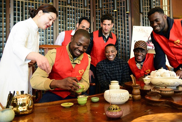 An international student gets hands-on instruction from a tea master in making tea while learning about traditional Chinese tea culture on April 14. [Photo by Shi Yucheng/IC]