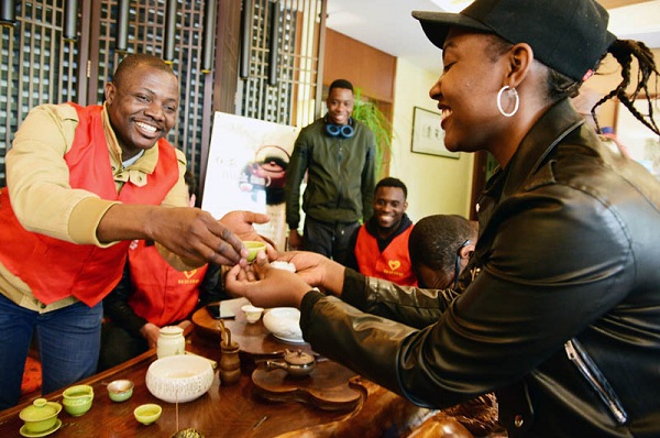 An international student from Jiangsu University serves a cup of self-brewed tea to his schoolmate on April 14. [Photo by Shi Yucheng/IC]