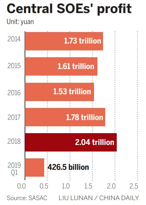 Central SOEs reported steady profit growth in the first quarter of 2019, as their combined profits saw year-on-year growth of 13.1 percent to 426.5 billion yuan ($63.5 billion) during this period, according to SASAC.