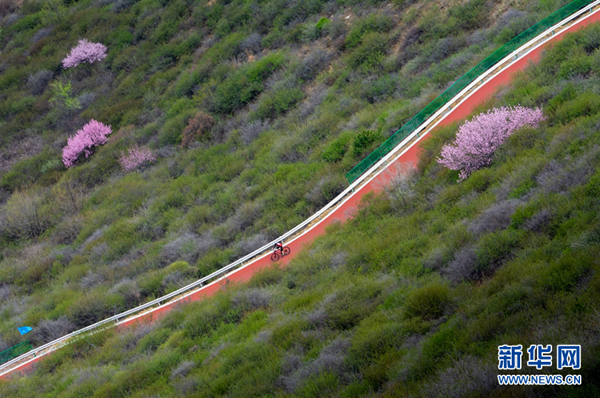 A lone cyclist pushes himself hard on a hillside road on Taihang Mountain. [Photo/Xinhua]